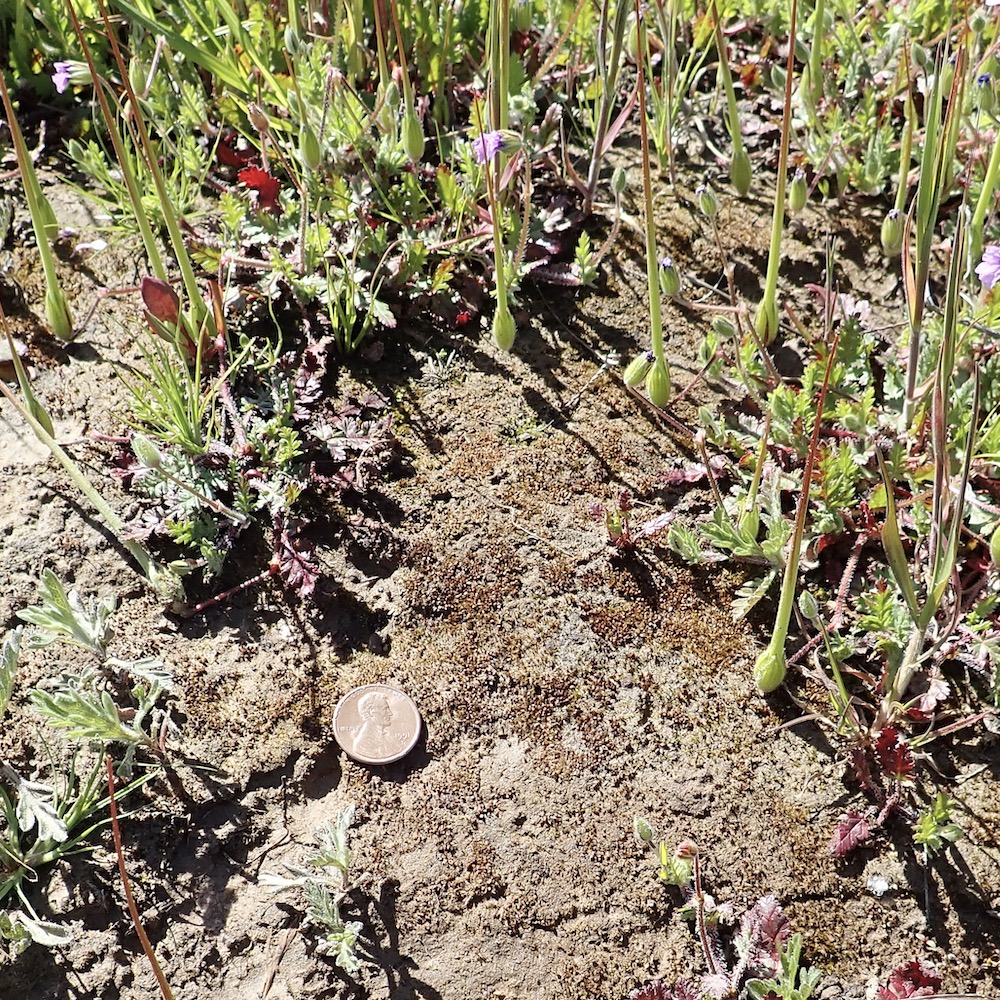 Habitat: Acaulon muticum is found on soil in disturbed habitats, such as along trails or surrounding ground squirrel burrow entrances, in partial shade or full sun.
