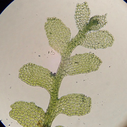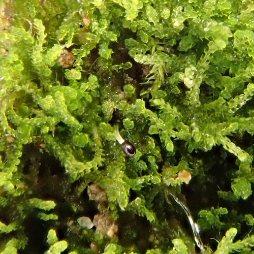 Leafy liverworts have a stem and leaves, typically arranged in two rows on either side of the stem, oftentimes with a third row of smaller leaves on the underside of the stem. Leafy liverworts are by far the most species-rich group of liverworts worldwide. Our local leafy liverworts tend to be quite small and are often overlooked.