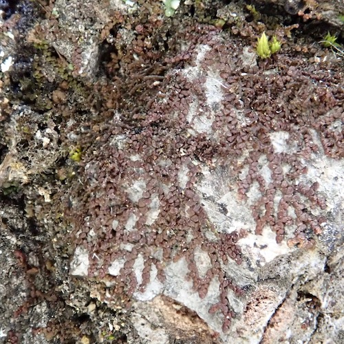The complex thallose liverworts have a body, or thallus, which is differentiated into distinct layers, hence the complexity. They tend to be thick and meaty, and many have pores on the surface giving them a somewhat reptilian look. Here in Santa Barbara County, our most commonly encountered species are Asterella californica (now Calasterella californica), Targionia hypophylla, and Cryptomitrium tenerum.