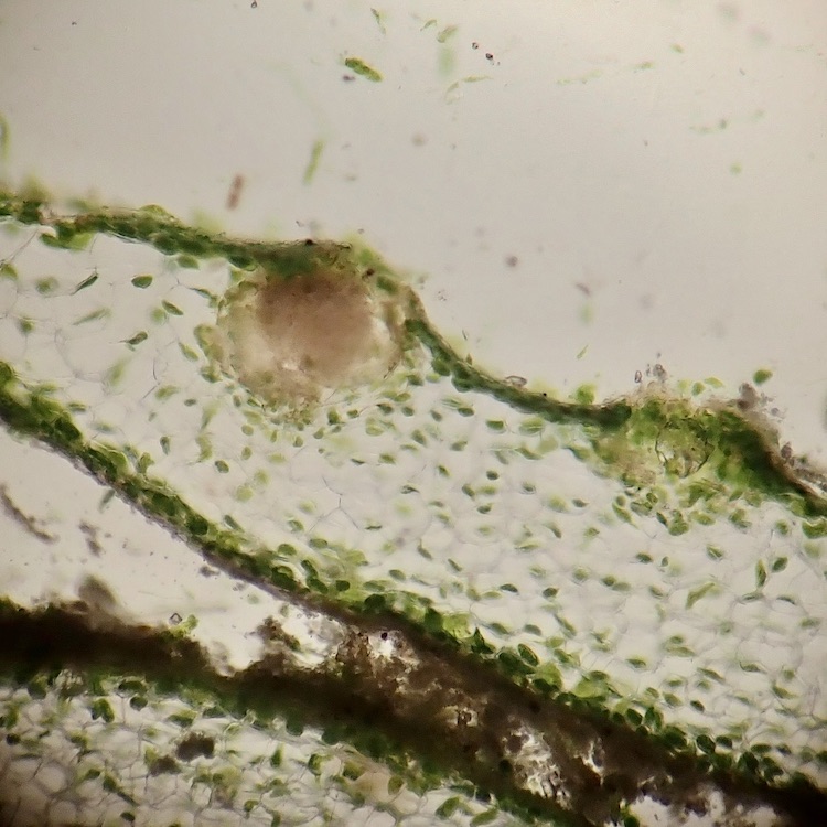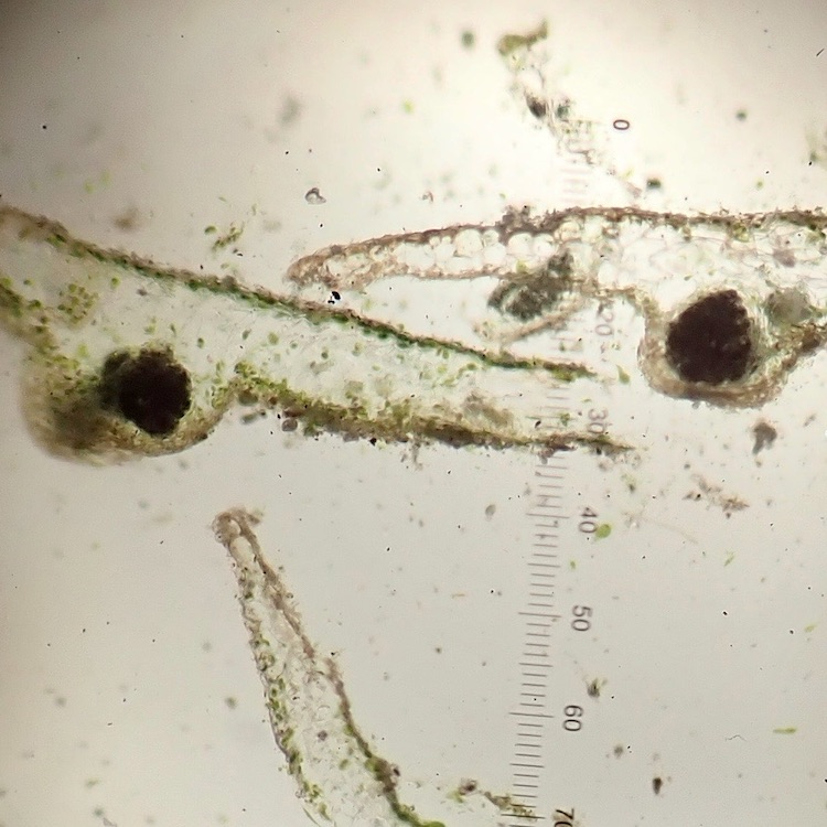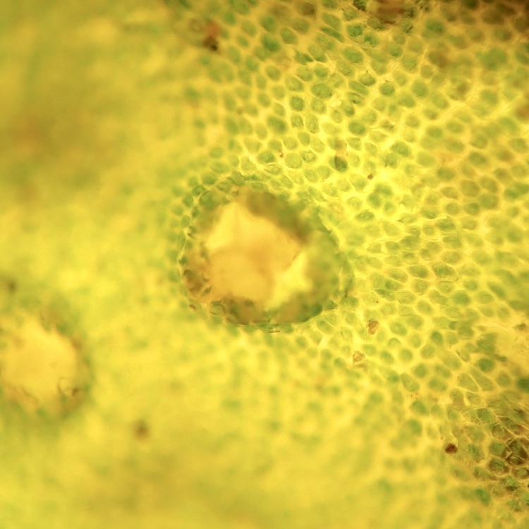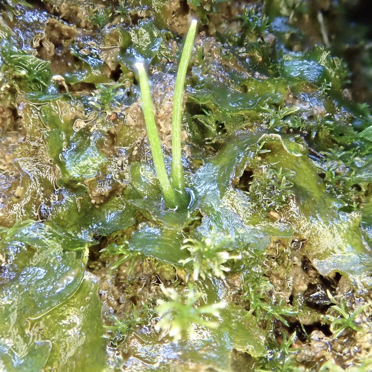 Description: Phaeoceros carolinianus is a hornwort with a smooth, deep-green thallus, which forms irregular, dichotomously branching ribbons. Here in Santa Barbara County, I have found it only at Nojoqui Falls. It is our only species that lacks both lamellae and tubers. Sporophytes are 2-5 cm tall, and mature spores are yellow, with fine spines on the distal face. In the absence of spores, it is helpful to look for antheridial pits on the upper surface, each containing 2-4 antheridia (male structures containing sperm), which are pale and quite large (up to 150 μm). Thallus cells have one large chloroplast with a central pyrenoid, visible as bumps or ridges at high magnification. Large, black, spherical colonies of cyanobacteria are often visible, particularly on the underside of the thallus.