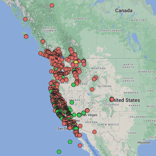 Anacolia menziesii collections. Map generated by google maps using data from the Consortium of Bryophyte Herbaria of accessioned collections from herbaria.