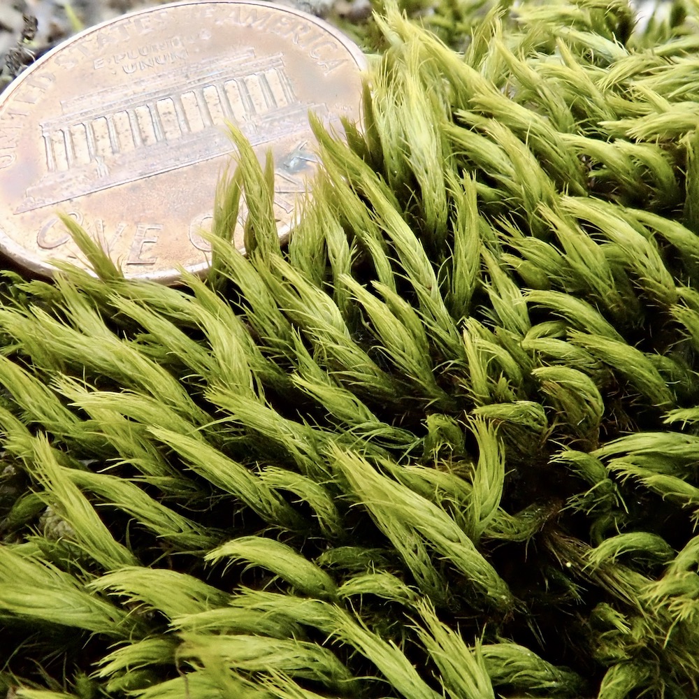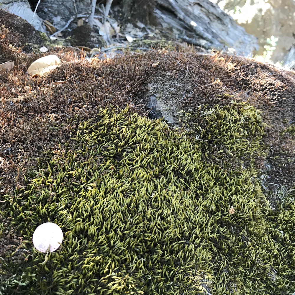 Habit:  Anacolia menziesii forms deep tufts that one can sink one’s fingers into. Tufts may be dense, with plants packed tightly together, or loose, with plants more widely spaced. When moist, tufts appear lush and furry. When dry, plants curve upward resulting in a windblown look.
