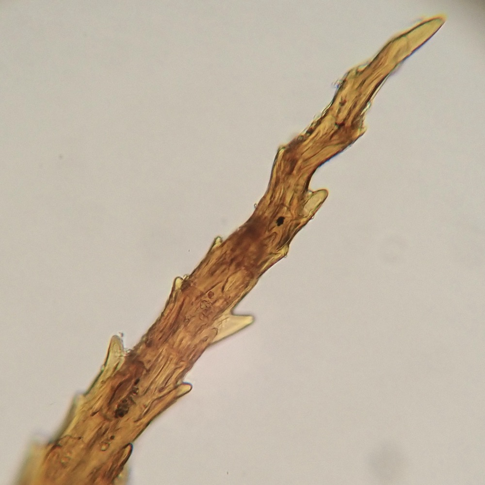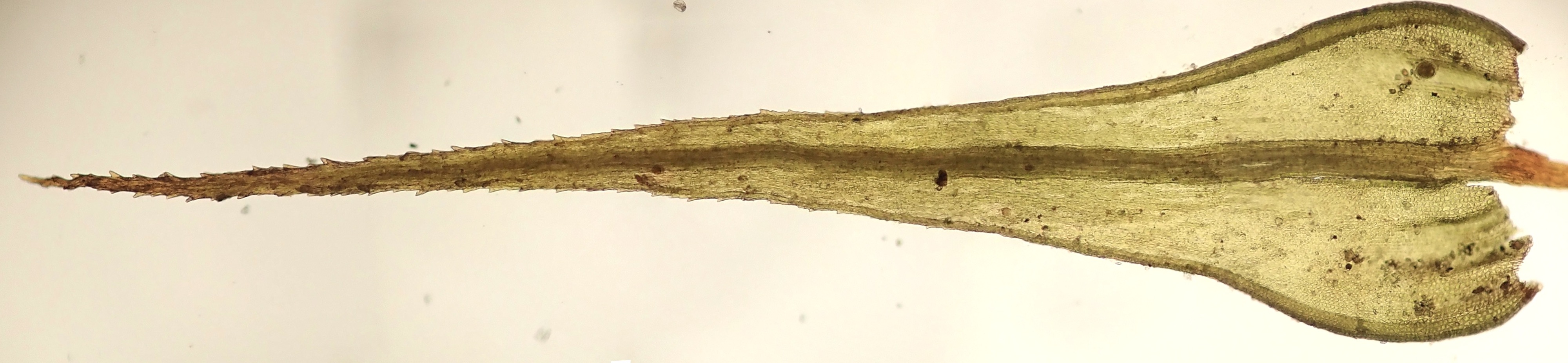 Anacolia menziesii leaf, tapers to a long, narrow, toothed tip, from a flared and pleated base, with recurved margins. (CAH #957, 100x) CC BY-NC Amanda Heinrich