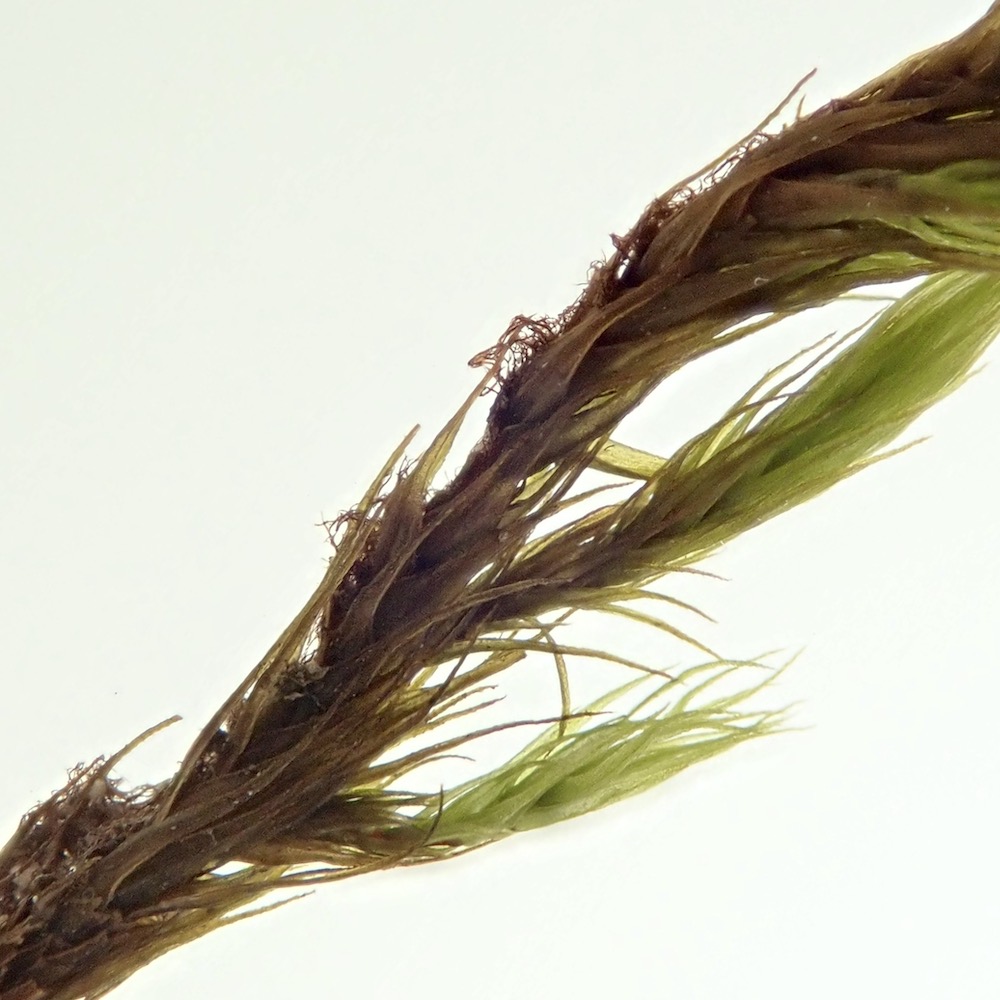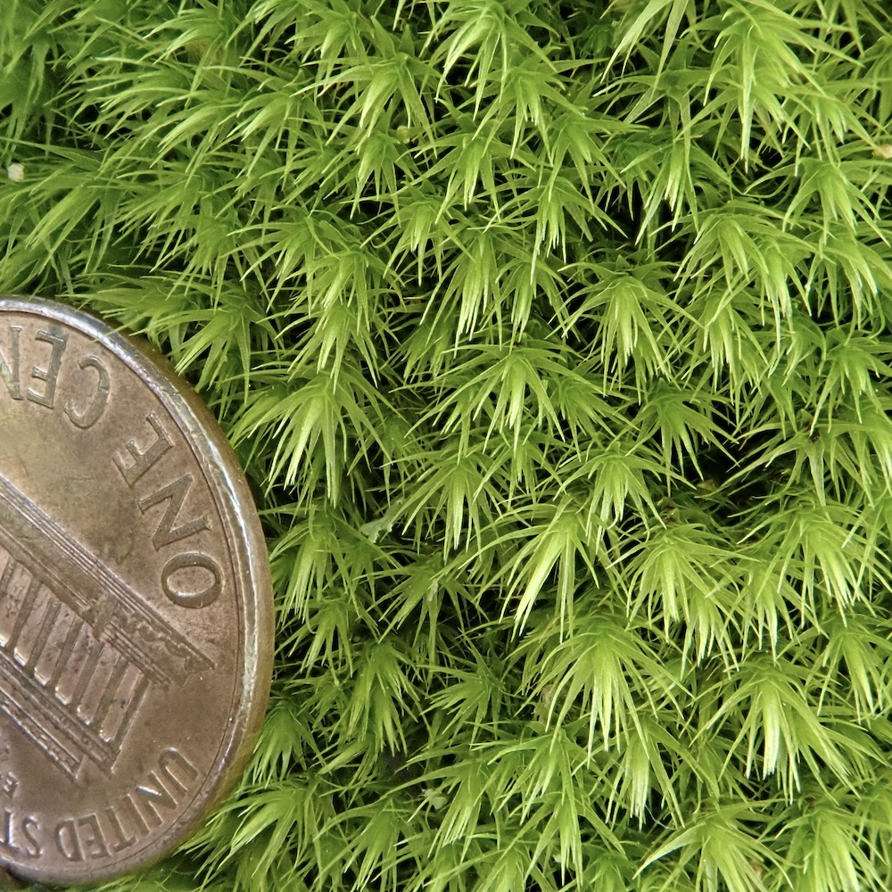 Plants:  Anacolia menziesii‘s long, narrow, pointy leaves spread from the stem when moist, creating a furry look. The leaves appress tightly to the stem when dry, and individual plants are clearly distinguished.