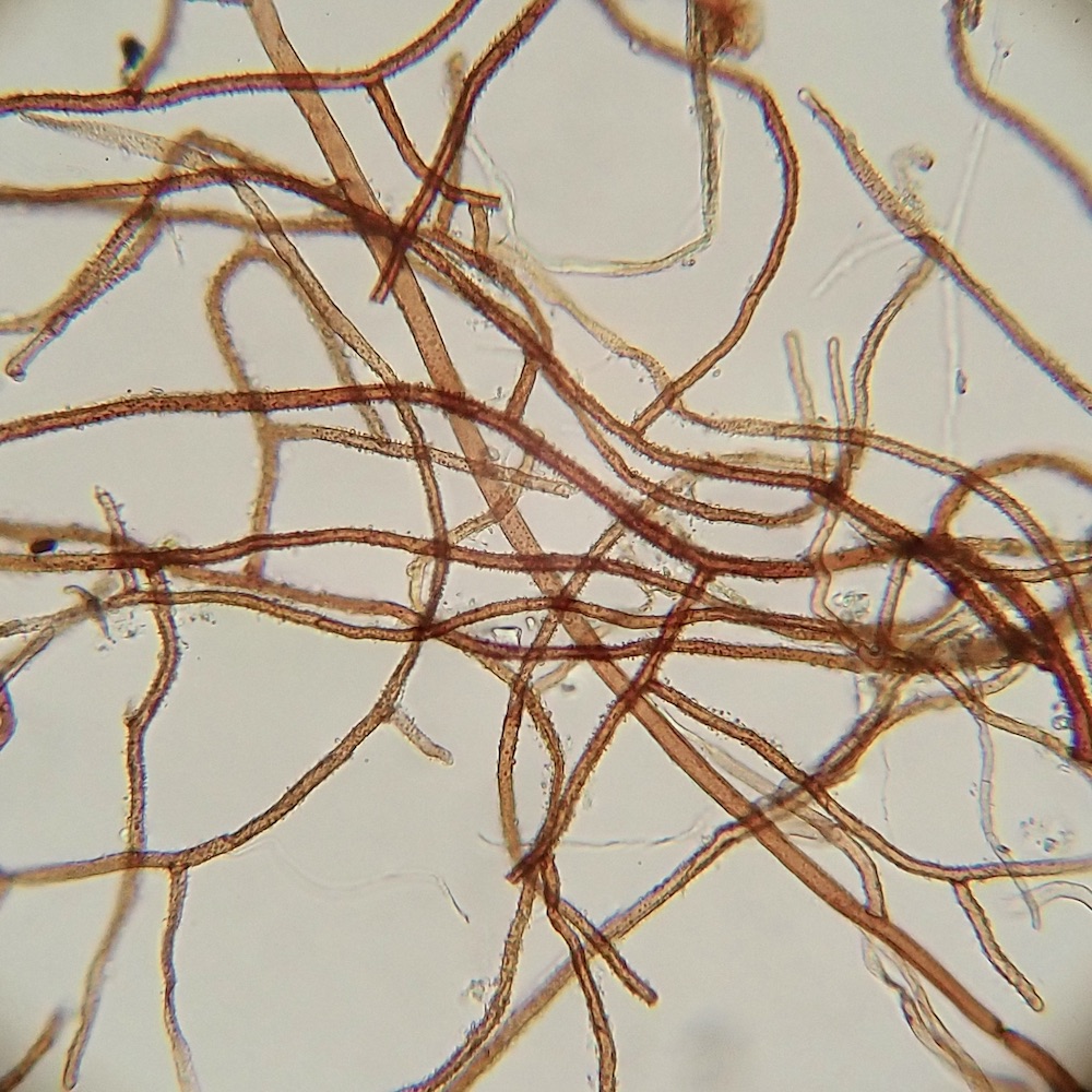 Anacolia menziesii‘s reddish-brown tomentum is composed of larger mostly smooth rhizoids and smaller papillose rhizoids. (CAH #957, 400x) CC BY-NC Amanda Heinrich