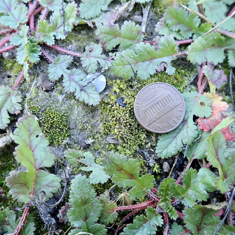 Stegonia hyalinotricha, just left of penny, on exposed soil amongst grasses, weeds and other mosses, in early February. CC BY-NC Amanda Heinrich
